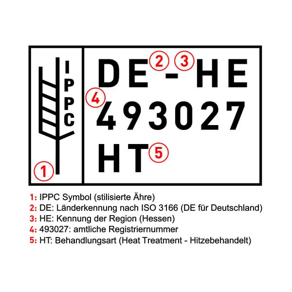 Der IPPC-Stempel enthält das IPPC-Logo, die Länderkennung, die vollständige Registriernummer des behandelten Betriebs sowie das Kürzel HT (Heat Treatment Behandlungsmethode). Die Kennzeichnung ist zeitlich unbegrenzt gültig, solange sie gut lesbar bleibt und das Holz unbeschädigt ist. Insgesamt sorgt der IPPC-Stempel für Rechtssicherheit, reibungslose Zollabwicklung, Pflanzenschutz und Vertrauen entlang der gesamten Lieferkette.